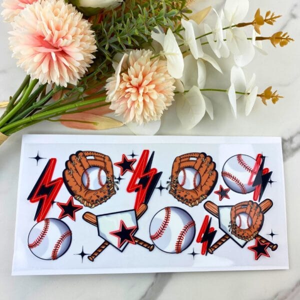 This Baseball Lightning Wrap is sized for 16oz Libbey can glasses (9.4″ x 4.2″), but can be used on any hard surface, plastic, or tumblers. It’s just peel and stick!