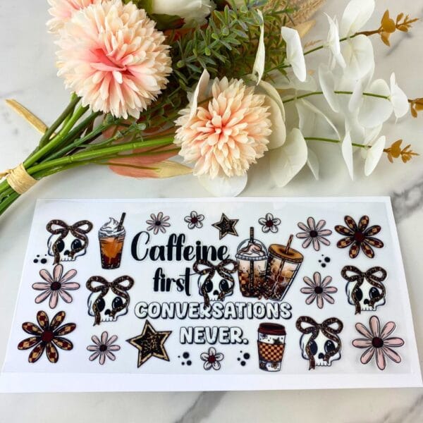 This Caffeine First Wrap is sized for 16oz Libbey can glasses (9.4″ x 4.2″), but can be used on any hard surface, plastic, or tumblers. It’s just peel and stick!