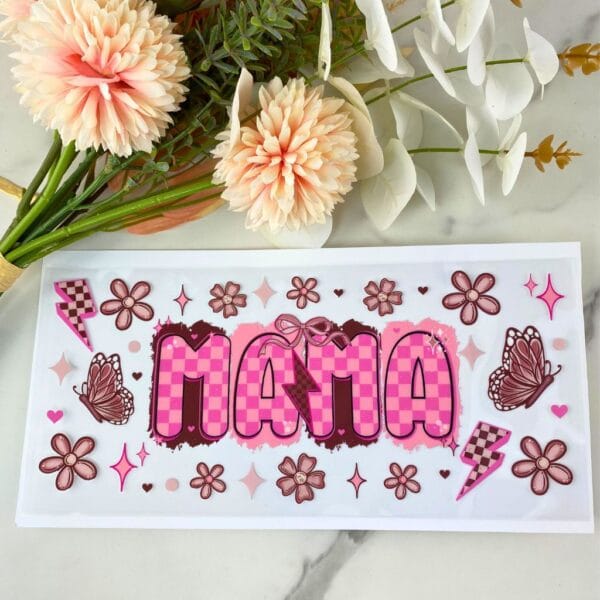 Tan and Pink Checkered Mama | 16 oz UV DTF Wrap