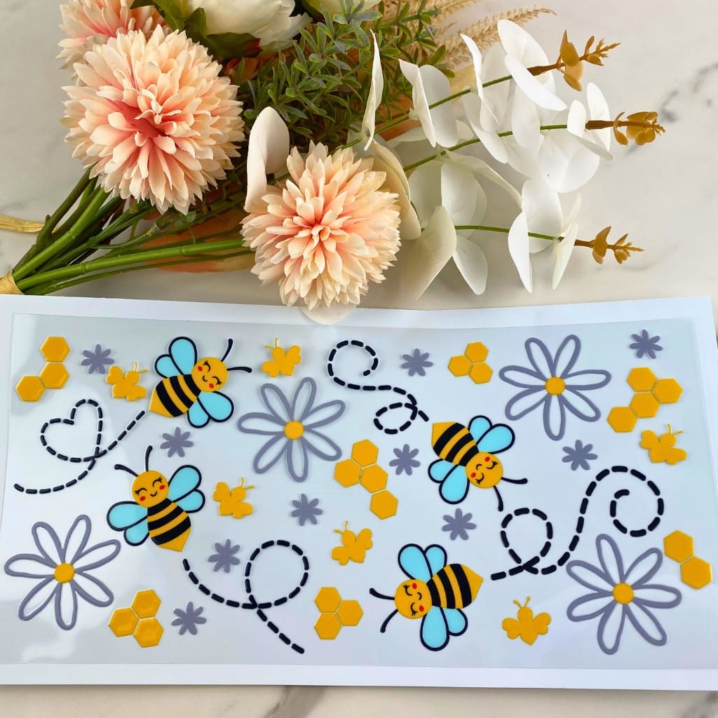 This Happy Bees Wrap is for 40 oz tumbler glasses (11″ x 5.25″) but can be used on any hard surface, plastic, or tumblers. It’s just peel and stick!
