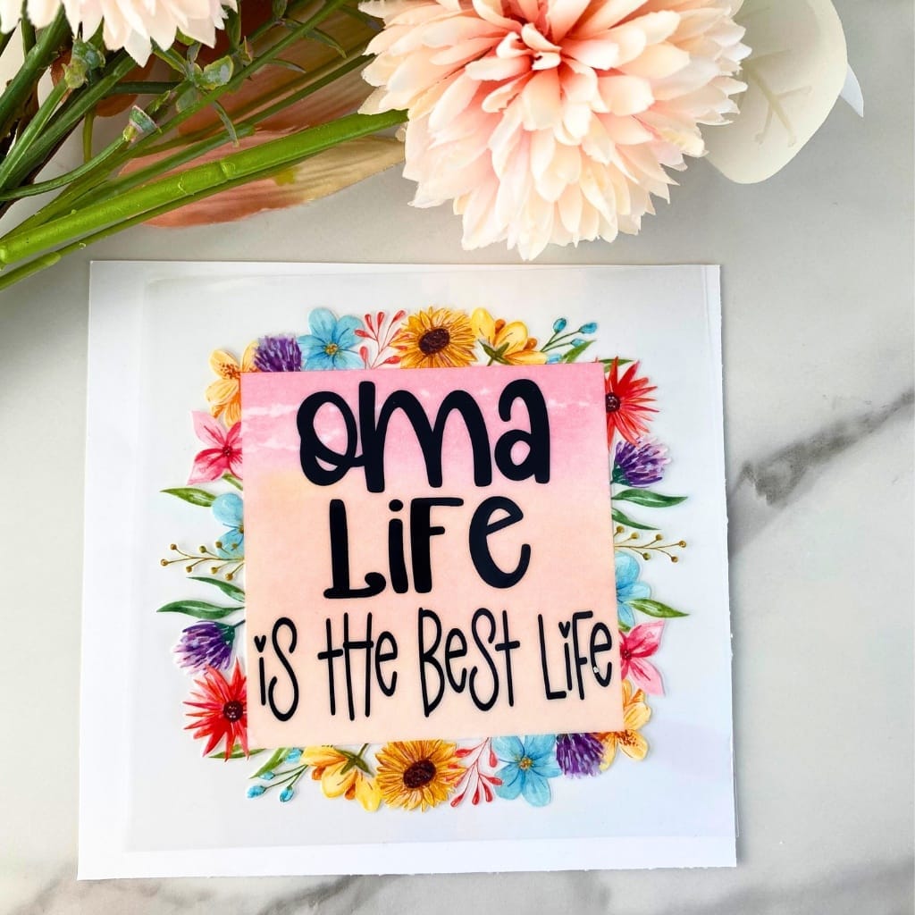 This Oma Life Decal is 4″ in height and is great for glasses, plastic, tumblers, or any other hard surface! Just peel and stick!