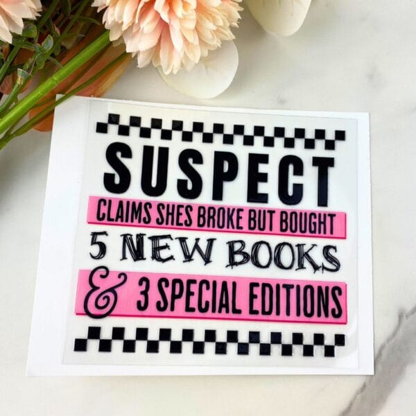This Suspect Buys New Books Decal is 4″ tall and great for glasses, plastic, tumblers, or any other hard surface. It’s just peel and stick!