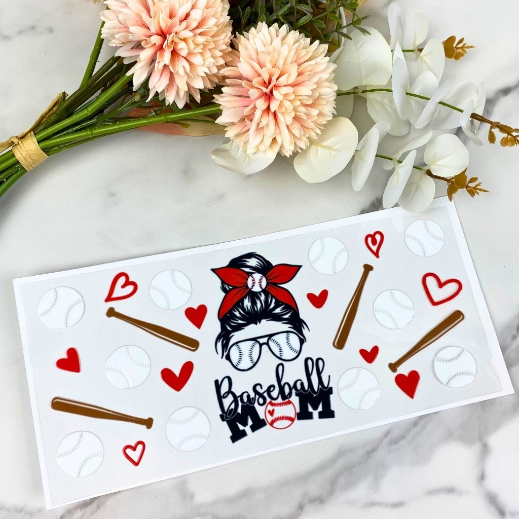 This Baseball Mom Wrap is sized for 16oz Libbey can glasses (9.4″ x 4.2″), but can be used on any hard surface, plastic, or tumblers. It’s just peel and stick!