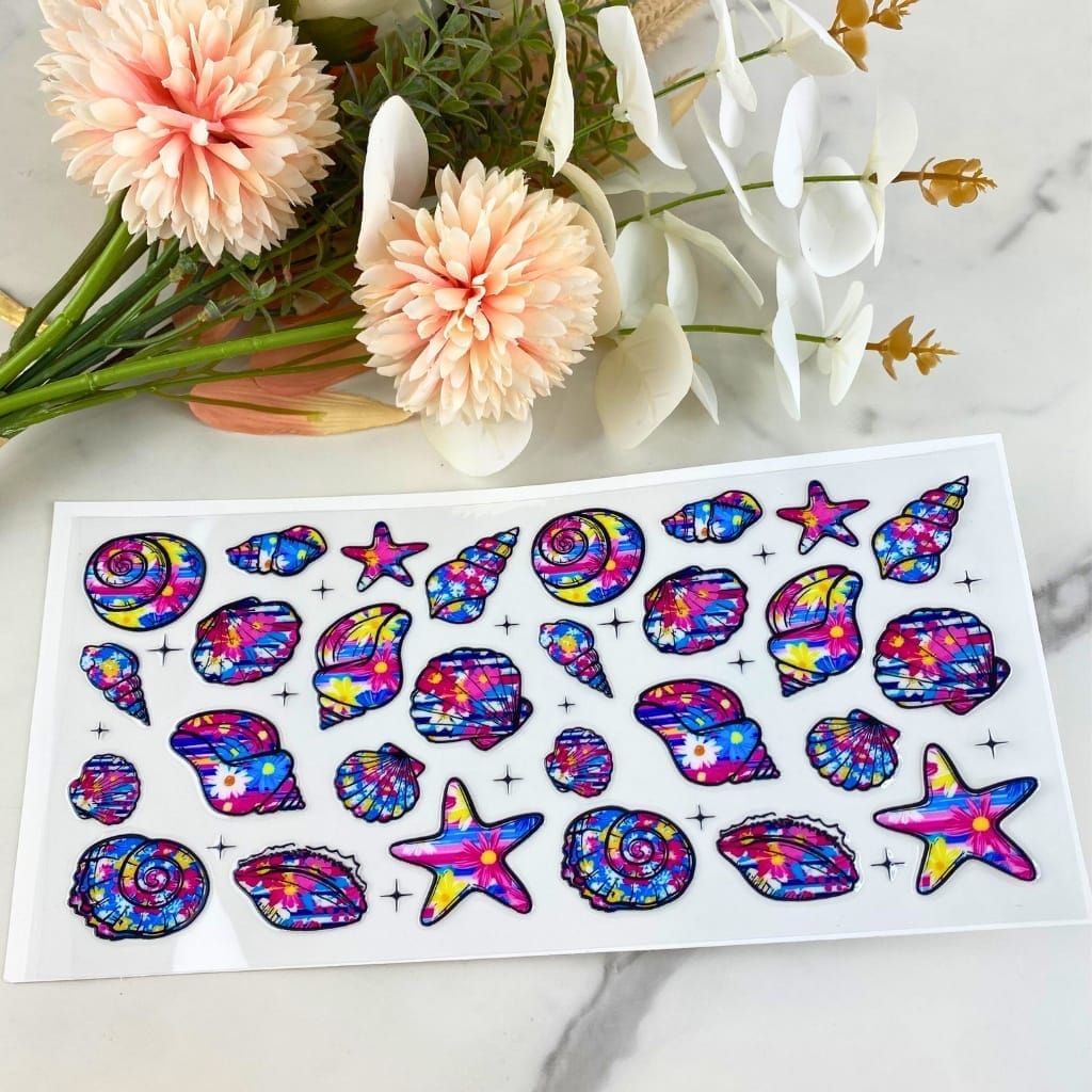 This Colorful Shells Wrap is sized for 16oz Libbey can glasses (9.4″ x 4.2″), but can be used on any hard surface, plastic, or tumblers. It’s just peel and stick!