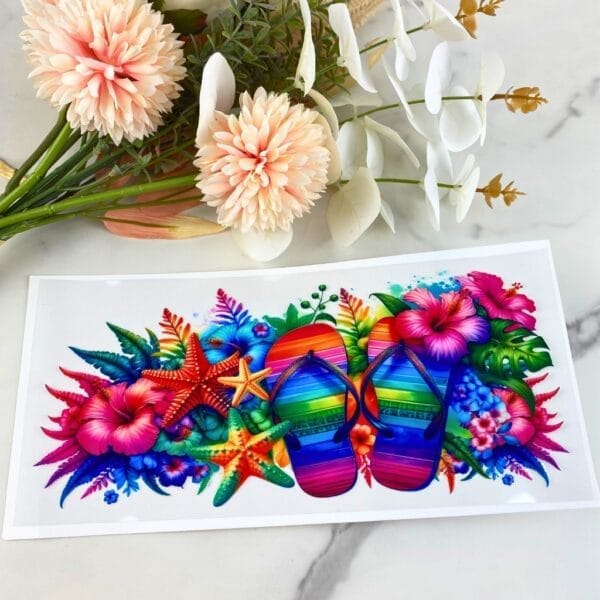 This Flip Flops Wrap is sized for 16oz Libbey can glasses (9.4″ x 4.2″), but can be used on any hard surface, plastic, or tumblers. It’s just peel and stick!