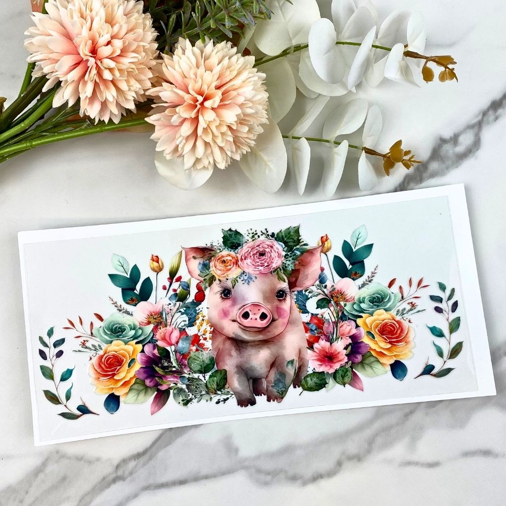This Floral Pig Wrap is sized for 16oz Libbey can glasses (9.4″ x 4.2″), but can be used on any hard surface, plastic, or tumblers. It’s just peel and stick!