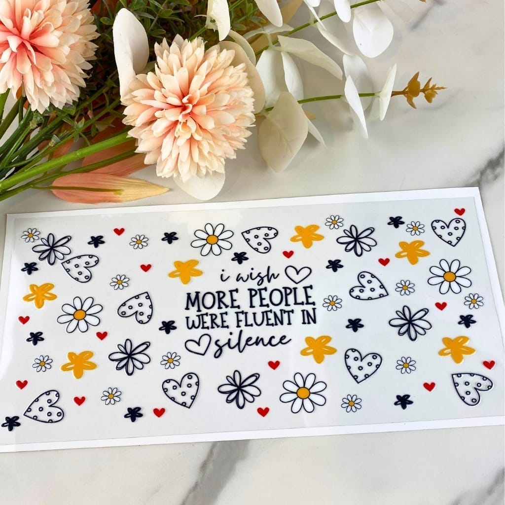 This Fluent in Silence Wrap is sized for 16oz Libbey can glasses (9.4″ x 4.2″), but can be used on any hard surface, plastic, or tumblers. It’s just peel and stick!