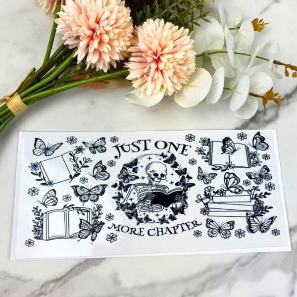 This Just One More Chapter Wrap is sized for 16oz Libbey can glasses (9.4″ x 4.2″), but can be used on any hard surface, plastic, or tumblers. It’s just peel and stick!
