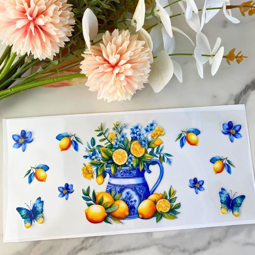 Lemons and Blue Flowers | 16 oz UV DTF Wrap