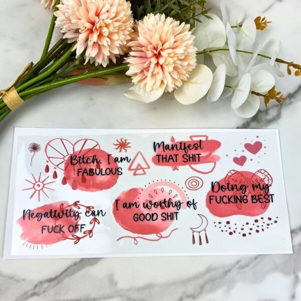 This Manifest that Wrap is sized for 16oz Libbey can glasses (9.4″ x 4.2″), but can be used on any hard surface, plastic, or tumblers. It’s just peel and stick!
