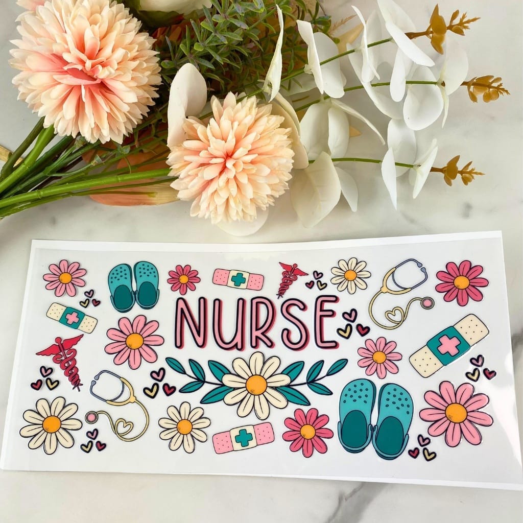 This Nurse Wrap is sized for 16oz Libbey can glasses (9.4″ x 4.2″), but can be used on any hard surface, plastic, or tumblers. It’s just peel and stick!