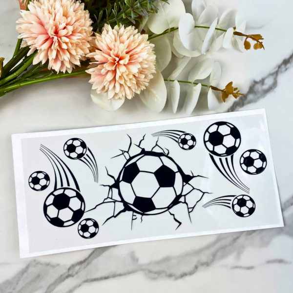 This Soccer Wrap is sized for 16oz Libbey can glasses (9.4″ x 4.2″), but can be used on any hard surface, plastic, or tumblers. It’s just peel and stick!