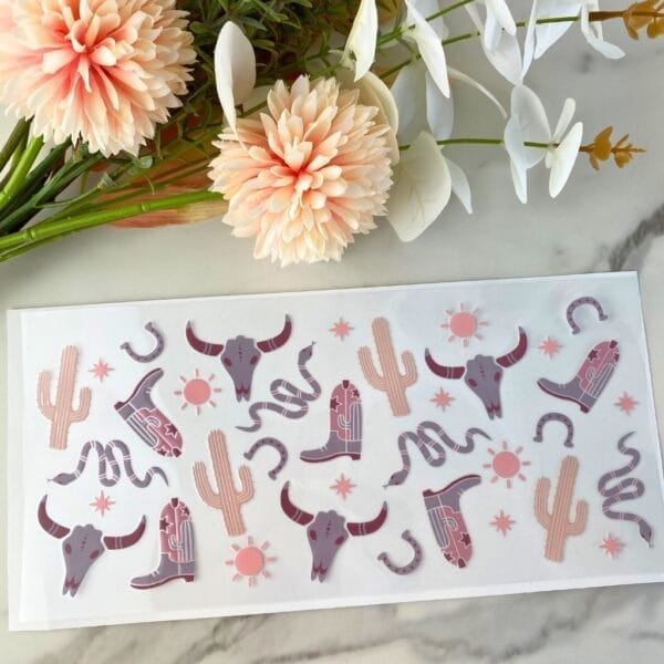 This Western Wrap is sized for 16oz Libbey can glasses (9.4″ x 4.2″), but can be used on any hard surface, plastic, or tumblers. It’s just peel and stick!
