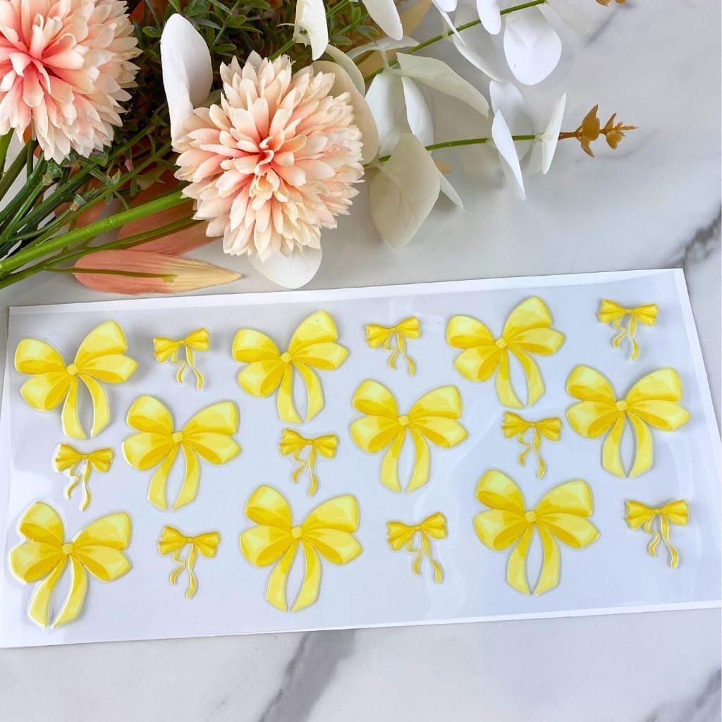 This Yellow Bows Wrap is sized for 16oz Libbey can glasses (9.4″ x 4.2″), but can be used on any hard surface, plastic, or tumblers. It’s just peel and stick!