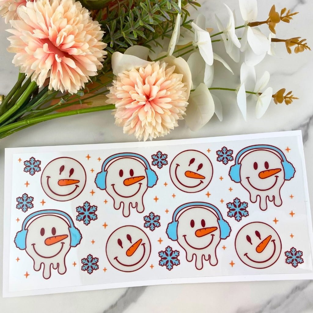 This Happy Snowman wrap is sized for Libbey glasses, but also works on plastic, tumblers, or any other hard surface. It’s just peel and stick!