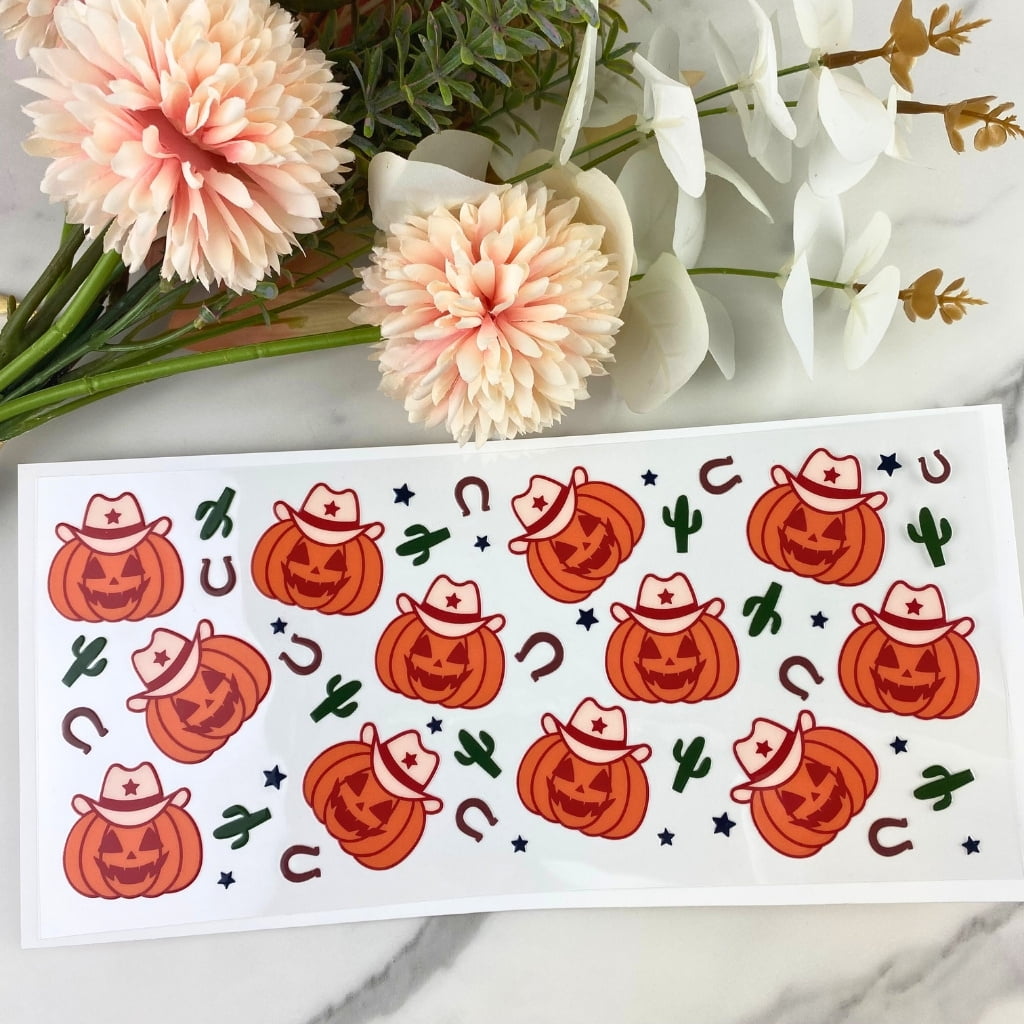 This Western Pumpkin wrap is sized for Libbey glasses, but also works on plastic, tumblers, or any other hard surface. It’s just peel and stick!
