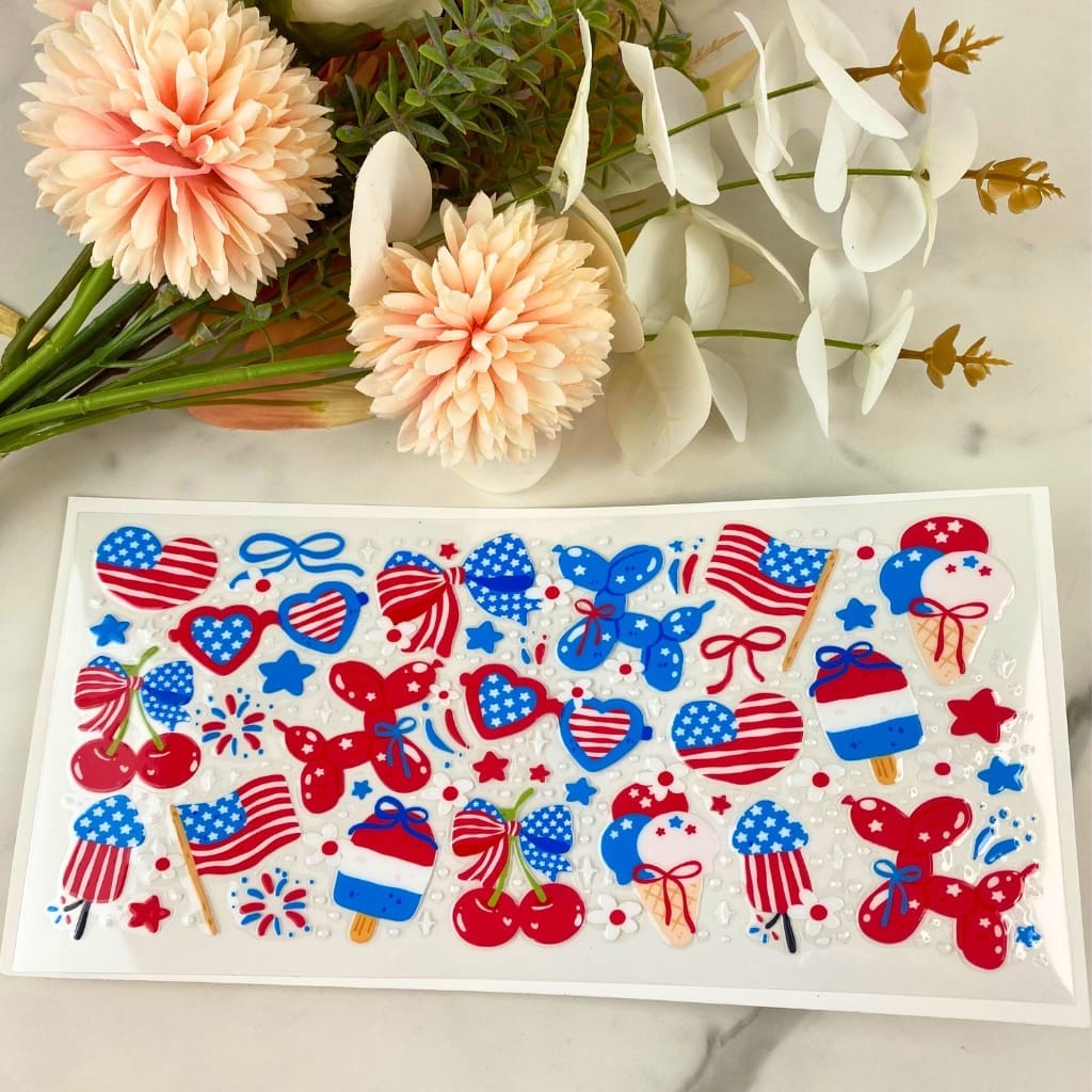 This 4th of July Celebration Wrap is sized for Libbey 16 oz glasses, but can also be used on plastic, tumblers, or any other hard surface. It’s just peel and stick!