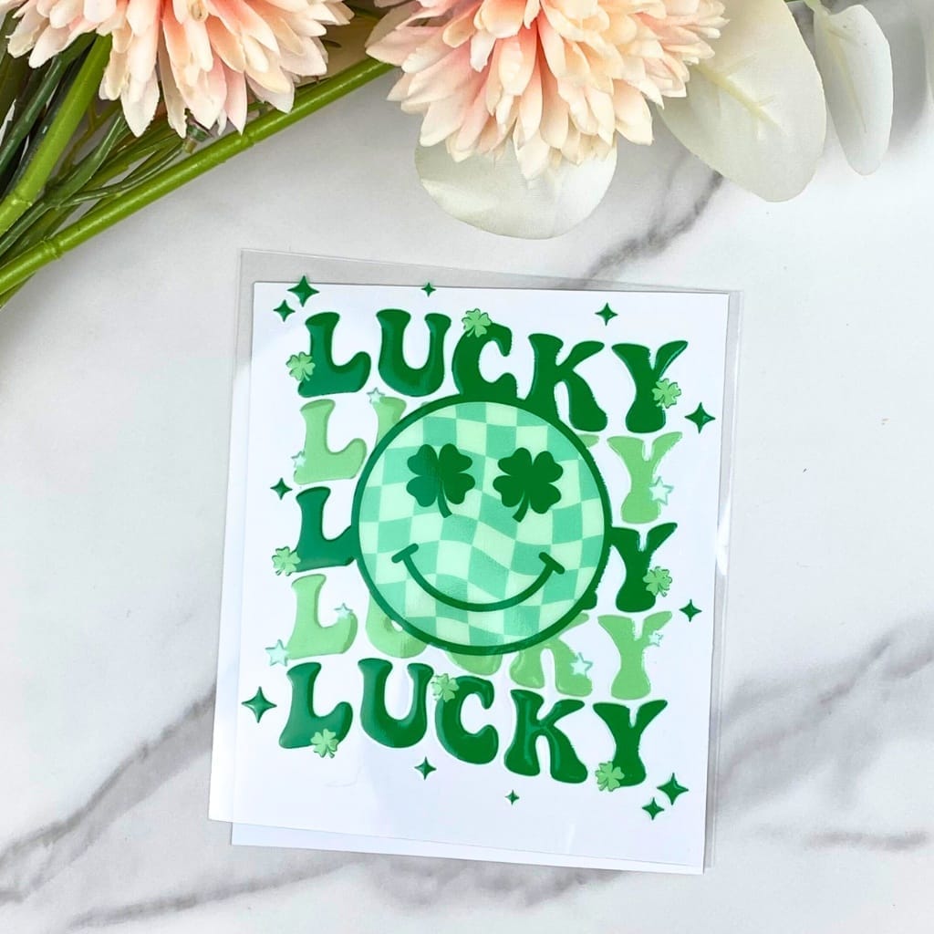 This Lucky Decal is 4″ tall and great for glasses, plastic, tumblers, or any other hard surface. It’s just peel and stick!
