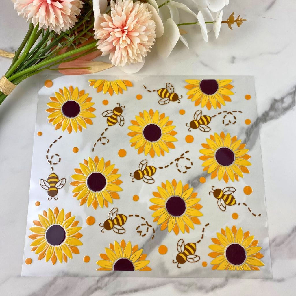 This Bees and Sunflowers Wrap is sized for 20 oz or 25 oz Tumblers (9.3″ x 8″), but can be used on any hard surface, plastic, or tumblers. It’s just peel and stick!