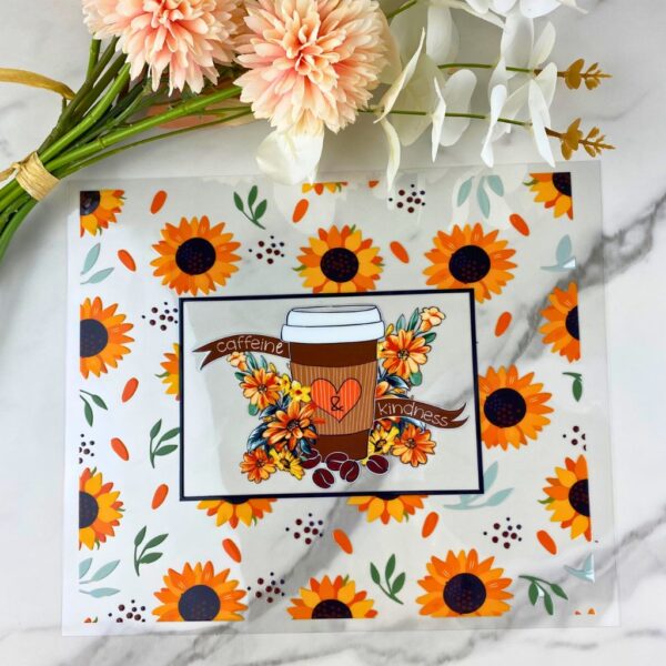 This Caffeine & Kindness Wrap is sized for 20 oz or 25 oz Tumblers (9.3″ x 8″), but can be used on any hard surface, plastic, or tumblers. It’s just peel and stick!
