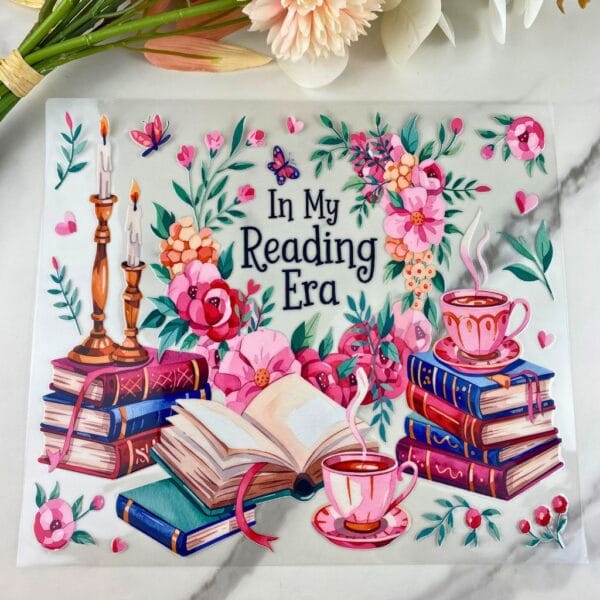 This In my reading Era Wrap is sized for 20 oz or 25 oz Tumblers (9.3″ x 8″), but can be used on any hard surface, plastic, or tumblers. It’s just peel and stick!
