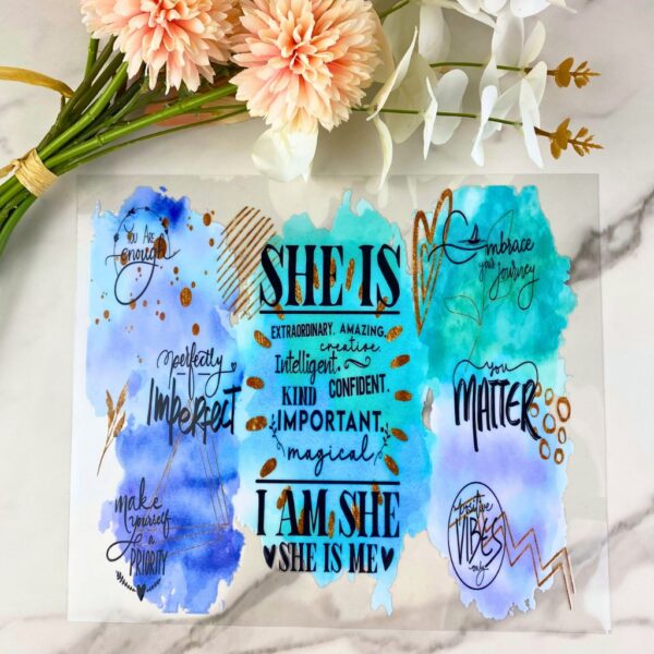 This She Is (Blue) Wrap is sized for 20 oz or 25 oz Tumblers (9.3″ x 8″), but can be used on any hard surface, plastic, or tumblers. It’s just peel and stick!