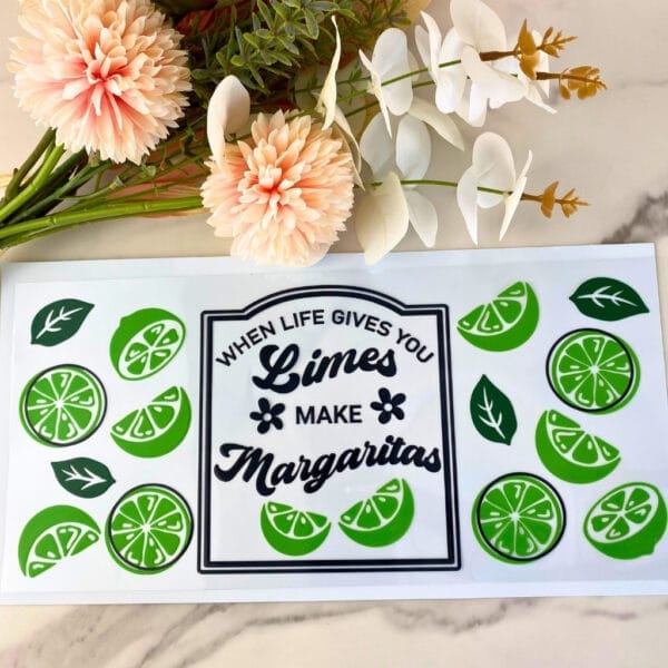 This When Life Gives You Limes Wrap is sized for 40 oz tumbler glasses (11″ x 5.25″) but can be used on any hard surface, plastic, or tumblers. It’s just peel and stick!