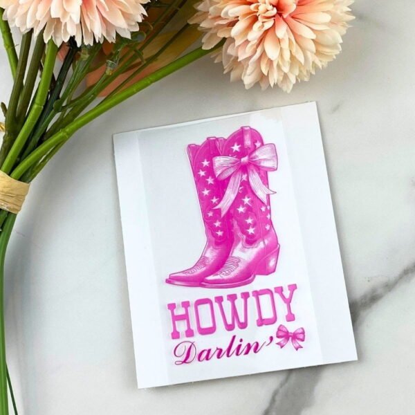 This Howdy Darlin Decal is 4″ tall and great for glasses, plastic, tumblers, or any other hard surface. It’s just peel and stick!