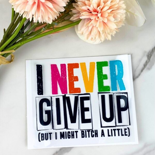 This I Never Give Up Decal is 4″ tall and great for glasses, plastic, tumblers, or any other hard surface. It’s just peel and stick!