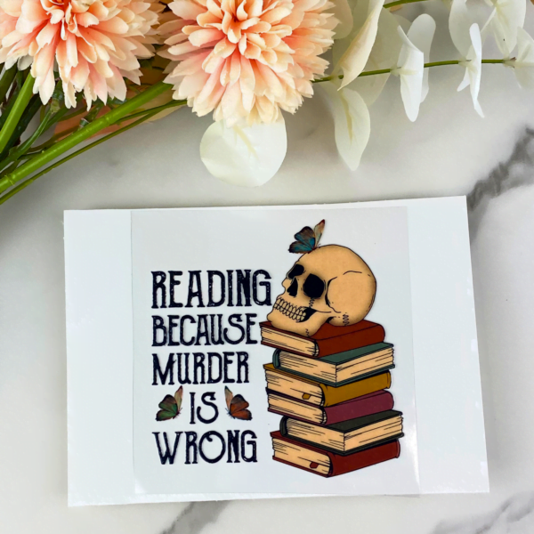 This Reading Because Murder is Wrong Decal is 4″ tall and great for glasses, plastic, tumblers, or any other hard surface. It’s just peel and stick!